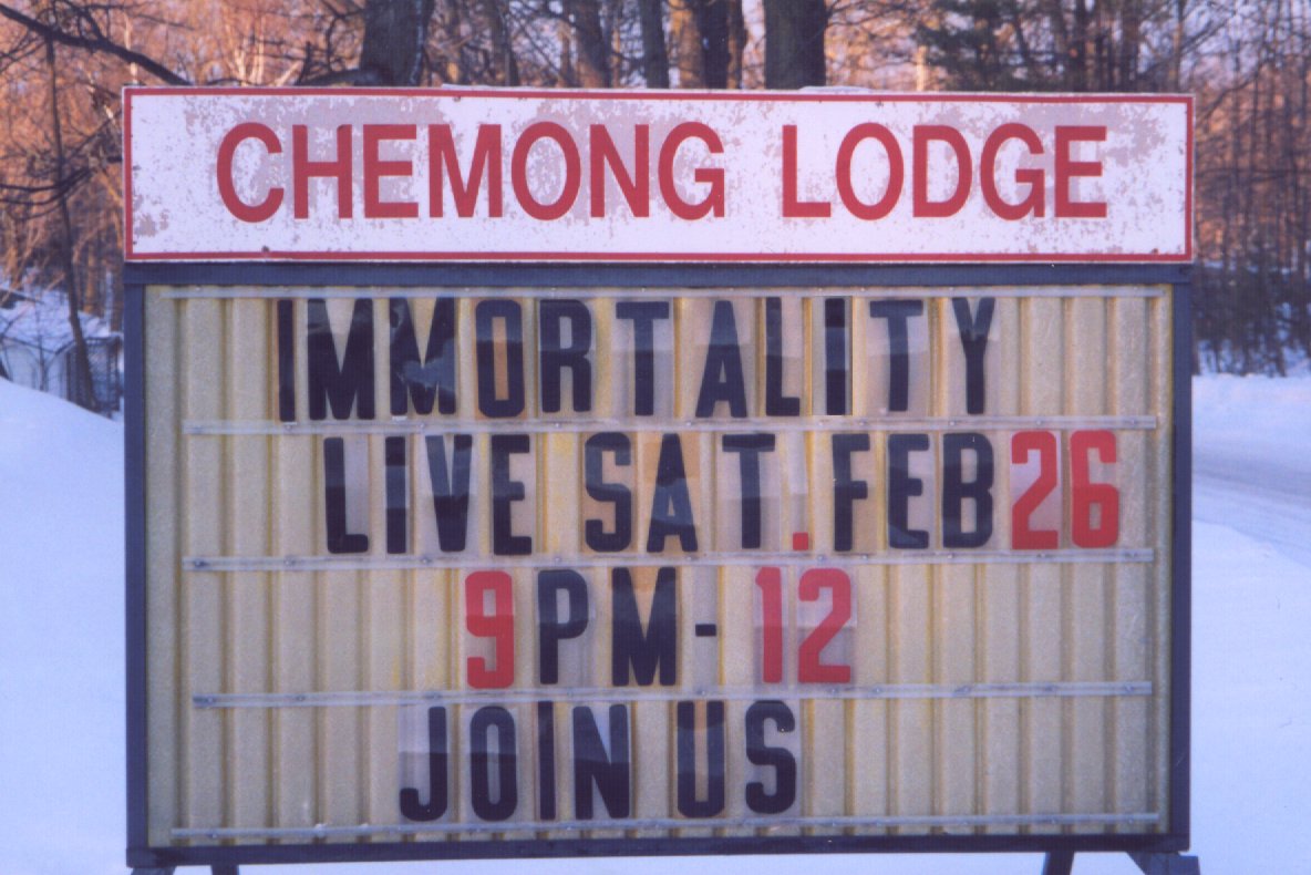 Lodge, Peterborough Doug Northey invited Immortality to play at the Chemong Lodge. The band played 3 full sets as listed below - the blues jam in the third set featured a guest appearance on harmonica by Alfie ??. ![]() |